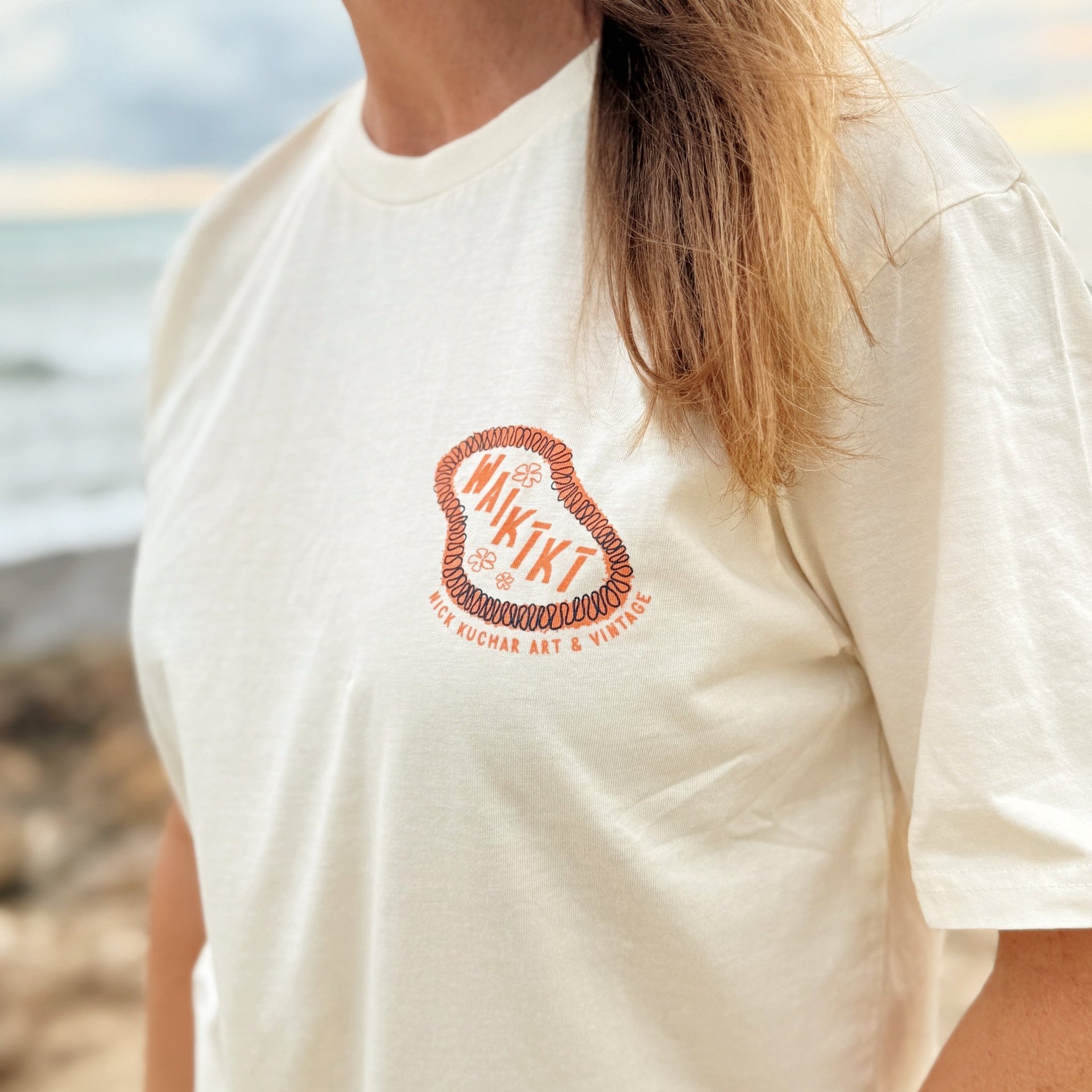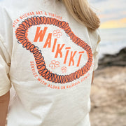 Our Waikīkī Tee womens tee features lei art on the front and back celebrating this famous stretch of beach and our shop at the Moana Surfrider Hotel. Printed on comfy 100% Cotton.