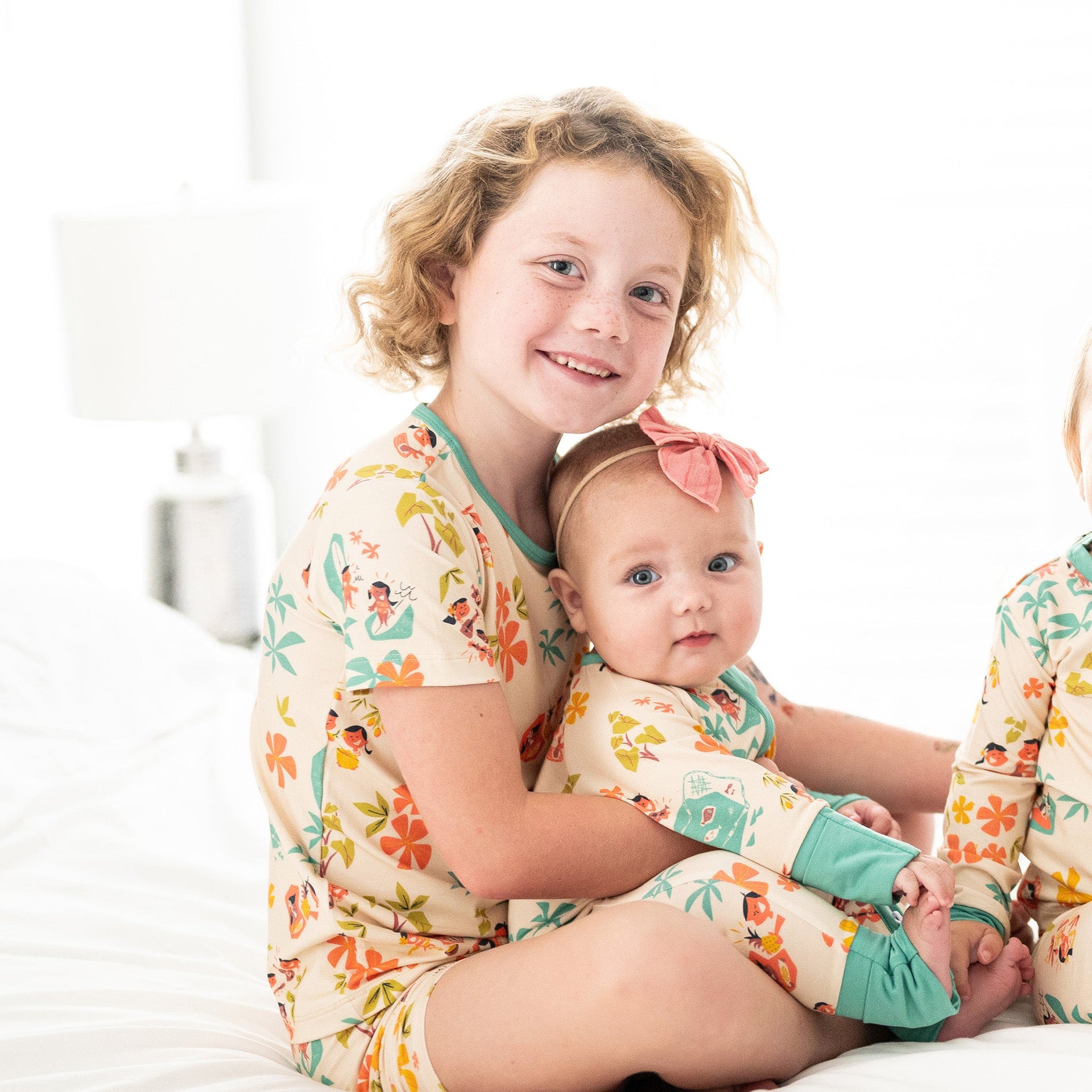 As your little ones continue to grow, they can still enjoy the buttery-softness of our onesies and coveralls with our two-piece pajama set. Dress them in a silky soft, stretchy short sleeve top and shorts so they can continue to wrap themselves up in aloha as they transition into toddler sizes.
