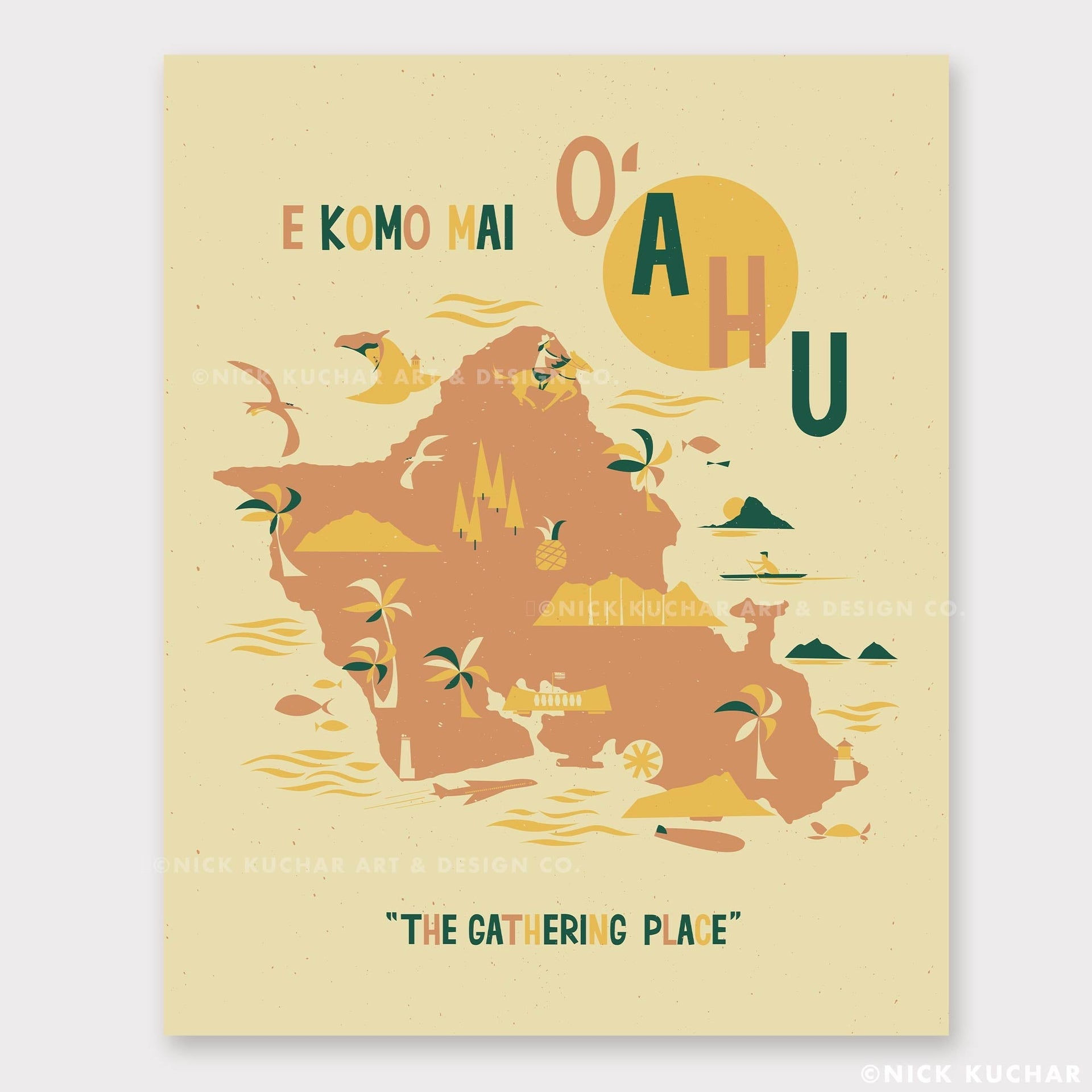 This O‘ahu map features some of our favorite spots of "The Gathering Place" like Le‘ahi (Diamond Head), Pearl Harbor, and the majestic Ko‘olau mountains appear in the stylized map design. E Komo Mai!