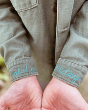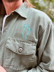 There's nothing quite like the hum of a nearly 100 year old machine laying down custom stitching on vintage fabric. The newest collaboration with Nick Kuchar and The Honolulu Social Club, these one of a kind originals include chain stitched renditions of Nick's art on vintage military jackets. Designed and made in Hawaii.
