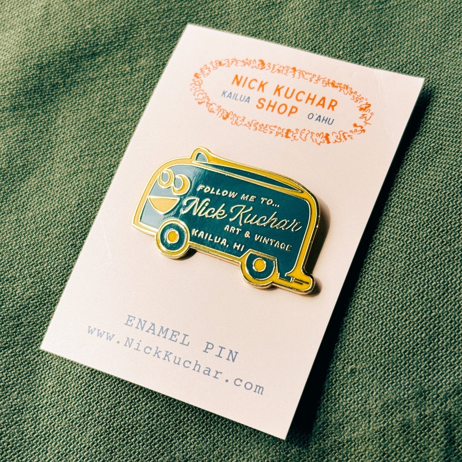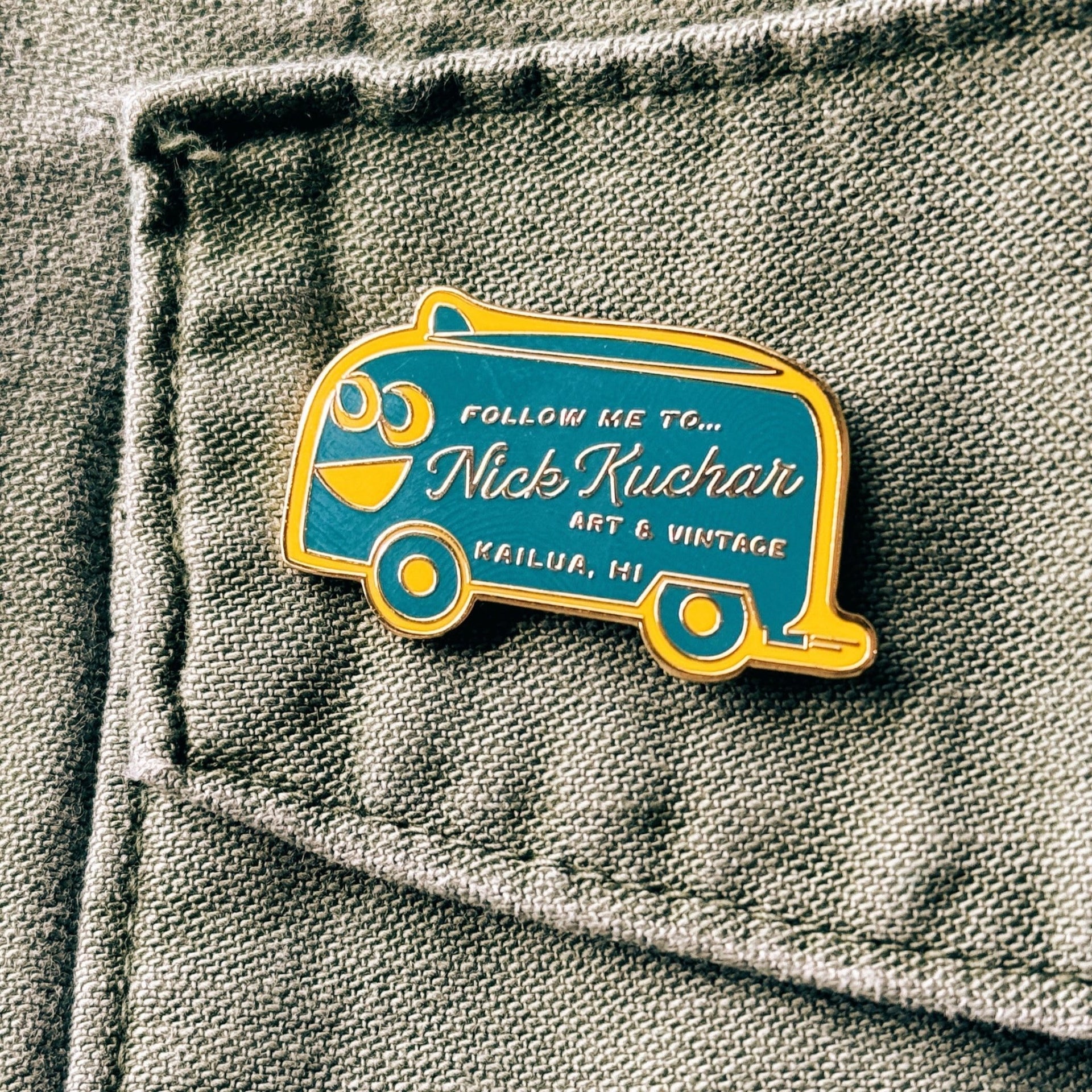 A cheerful nod to adventure and good vibes. This enamel pin features our signature smiling happy bus - an icon of laid-back island cruising and a familiar face at the Nick Kuchar Shop.