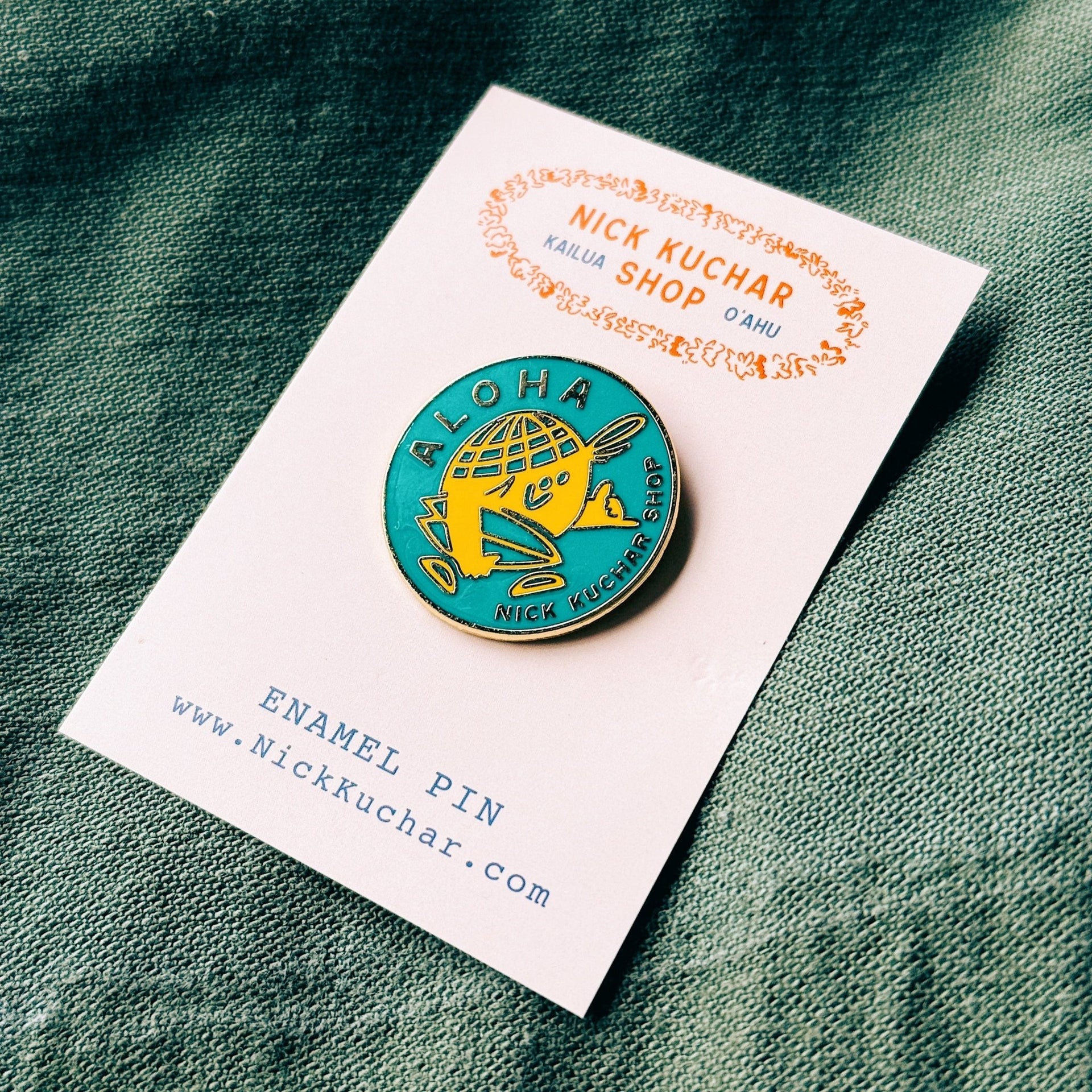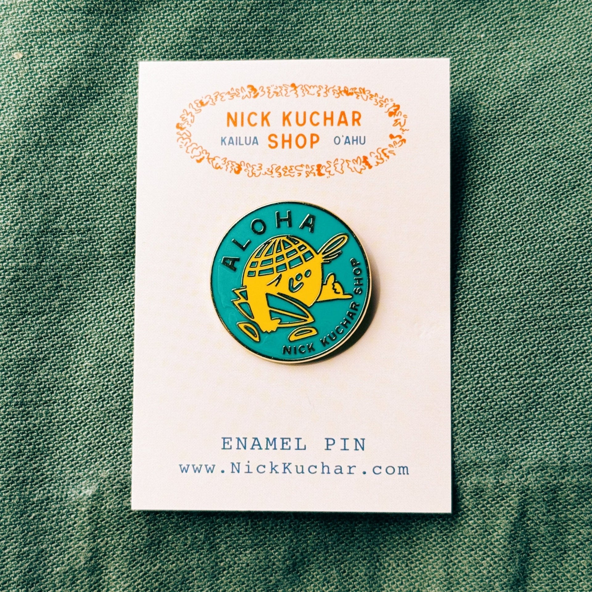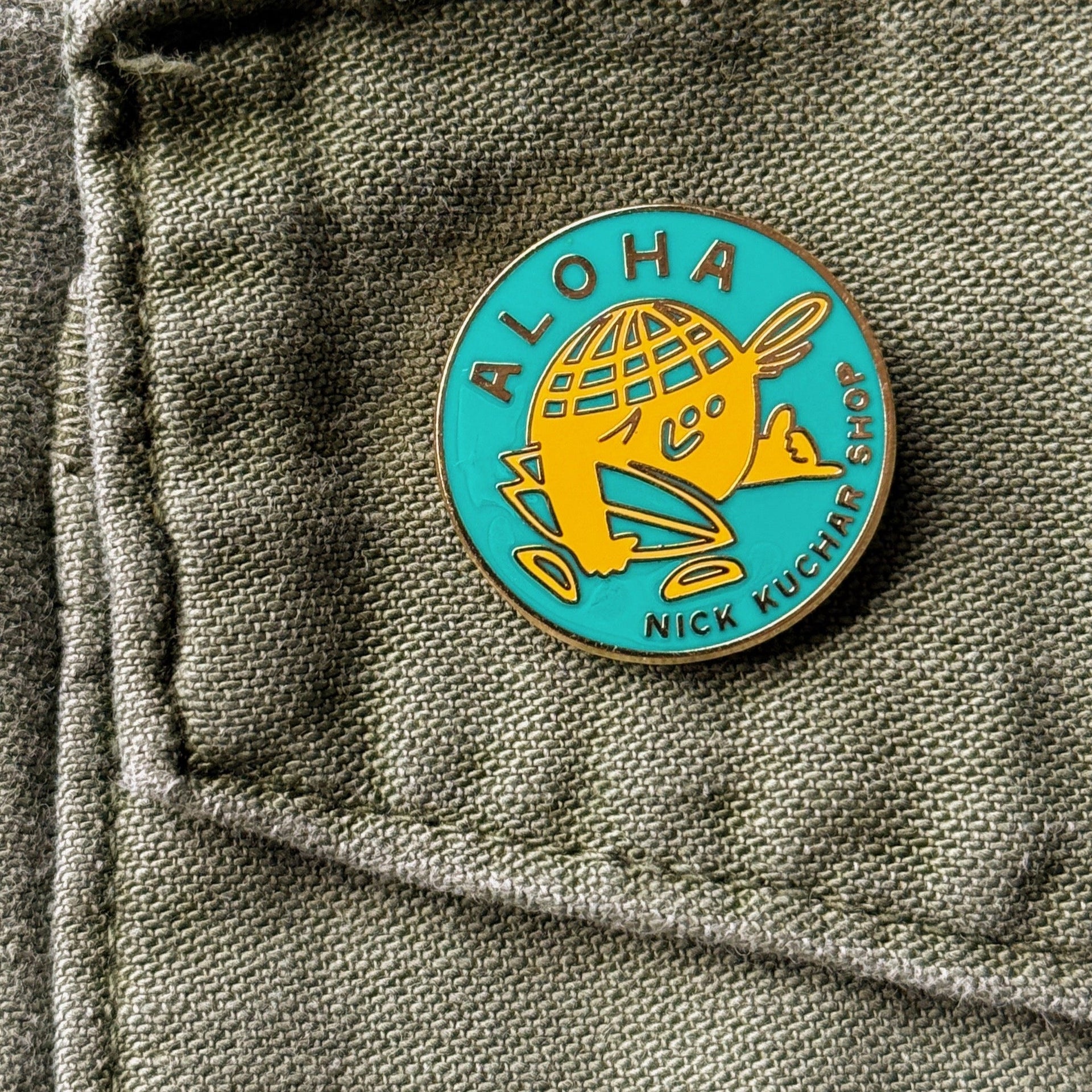 A fun nod to our shop and our favorite island greeting. This enamel pin features our Nick Kuchar Shop character - laid-back, welcoming, and always stoked.