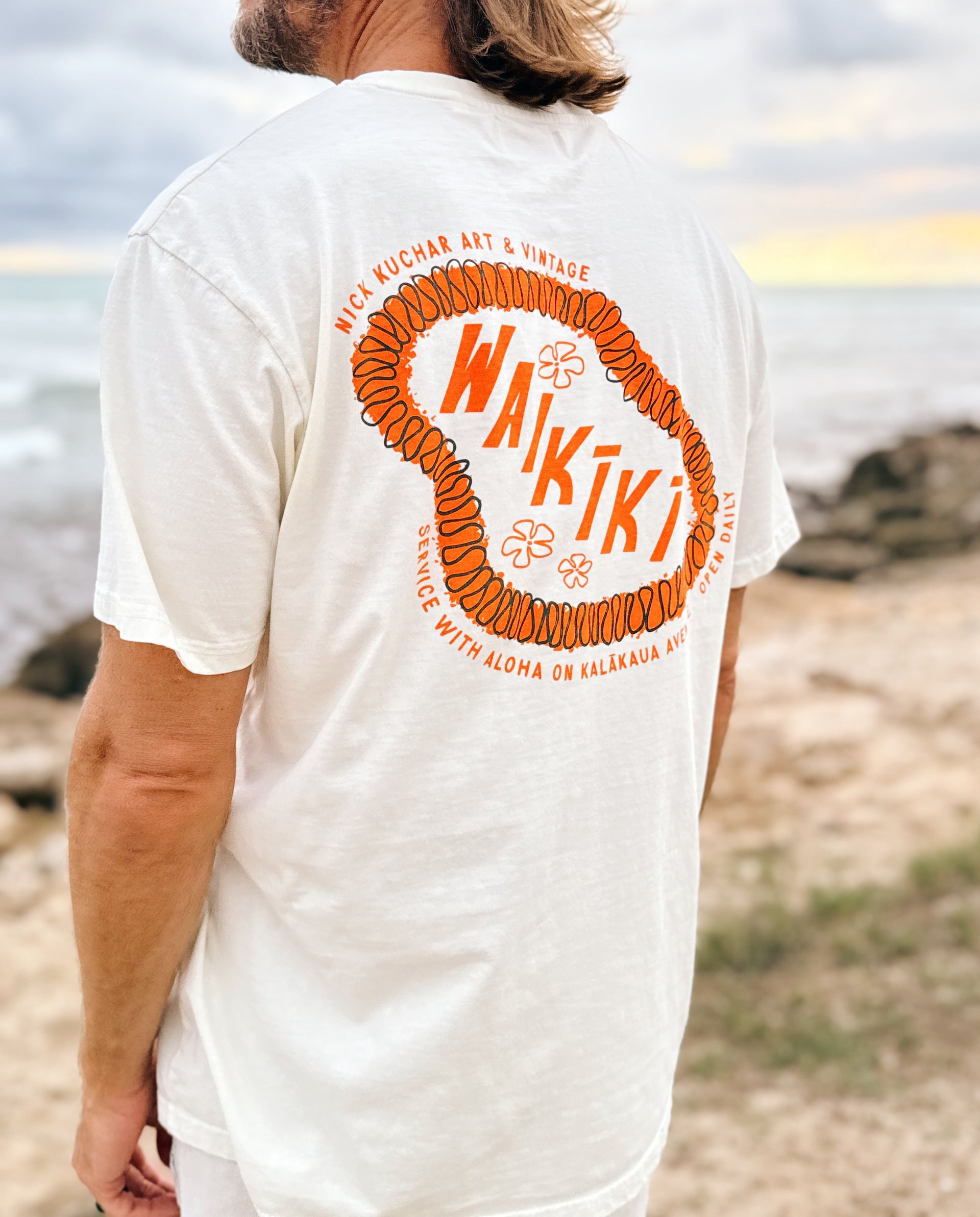 Our Waikīkī Tee features lei art on the front and back celebrating this famous stretch of beach and our shop at the Moana Surfrider Hotel. Printed on comfy 100% Cotton.